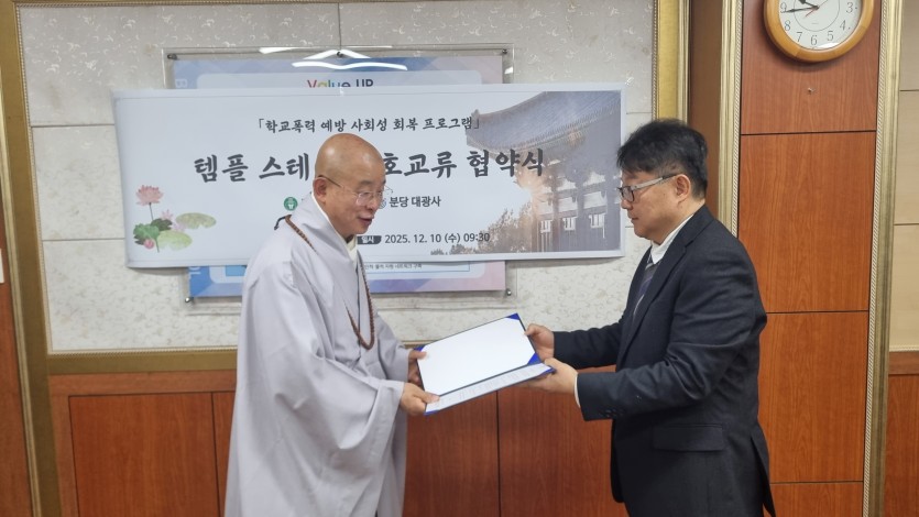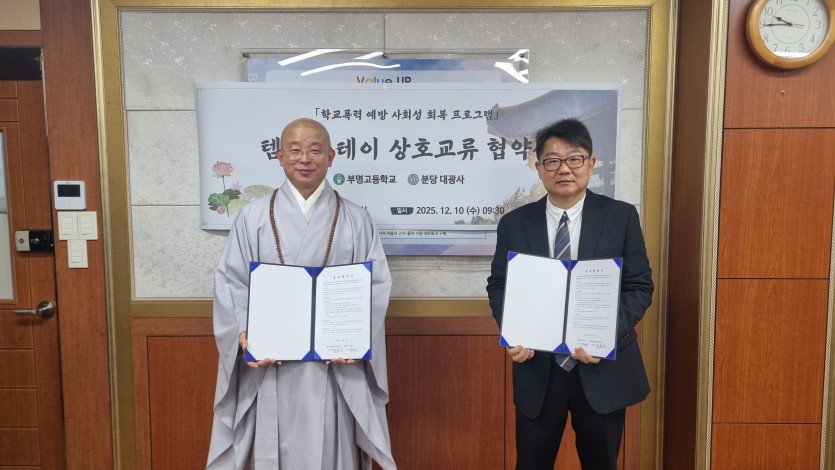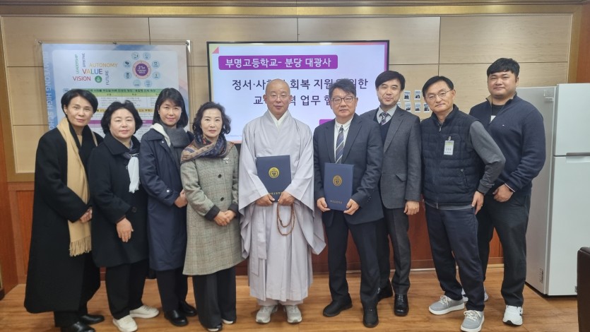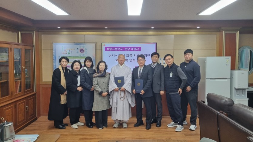 행사 사진 | 대광사-부천부명고등학교 학교폭력 예방 사회성 회복 프로그램 MOU 체결 (명상 특화 프로그램) 페이지 정보 작성자 대광사 작성일25-12-10 16:16 조회8회 댓글0건 본문 추천 0 비추천 0 페이스북 트위터 댓글목록 등록된 댓글이 없습니다. 이전글 다음글 목록